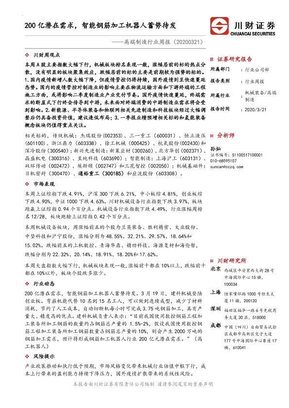 【川财证券】【20200321】20200321-川财证券-高端制造行业周报:200亿潜在需求,智能钢筋加工机器人蓄势待发-9页