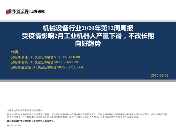 【华创证券】【20200322】机械设备行业2020年第12周周报:受疫情影响2月工业机器人产量下滑,不改长期向好趋势-30页
