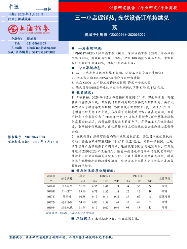 【上海证券】【20200323】机械行业周报:三一小店促销热,光伏设备订单持续兑现-6页