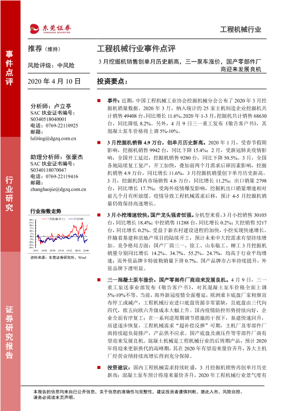 【东莞证券】【20200410】20200410-东莞证券-工程机械行业事件点评:3月挖掘机销售创单月历史新高,三一泵车涨价,国产零部件厂商迎来发展良机-3页