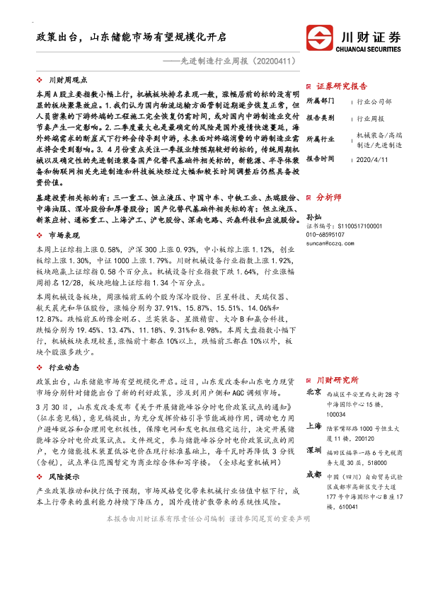 【川财证券】【20200411】先进制造行业周报:政策出台,山东储能市场有望规模化开启-9页