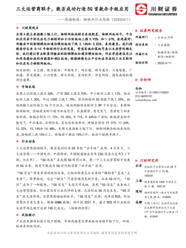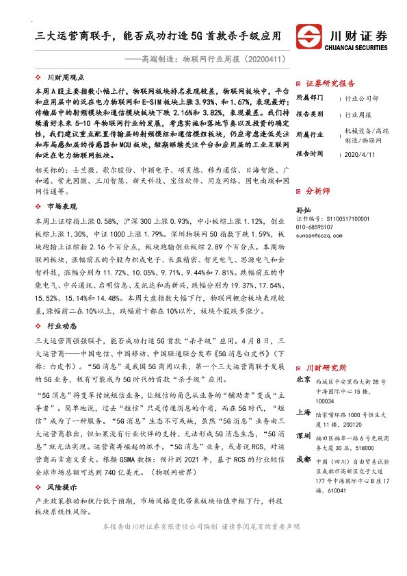 【川财证券】【20200411】高端制造:物联网行业周报:三大运营商联手,能否成功打造5G首款杀手级应用-19页