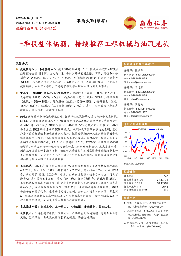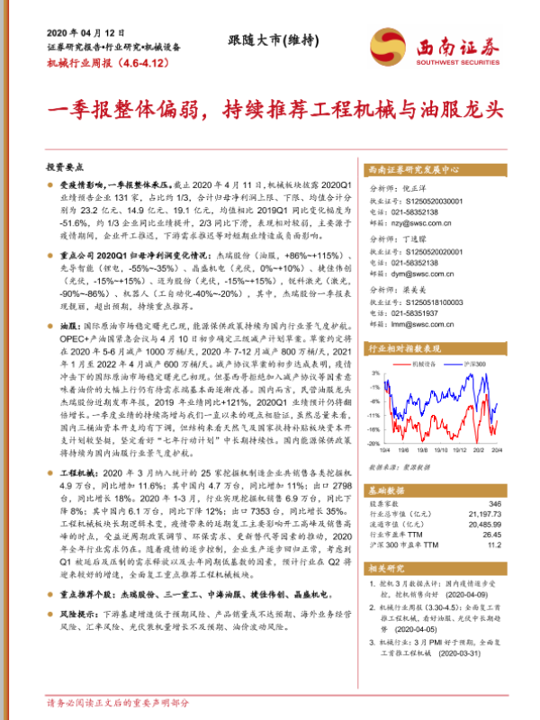 【西南证券】【20200412】机械行业周报:一季报整体偏弱,持续推荐工程机械与油服龙头-14页