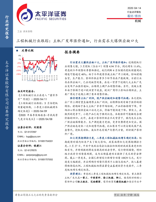 【太平洋证券】【20200414】工程机械行业跟踪:主机厂发布涨价通知,行业需求火爆供应缺口大-5页