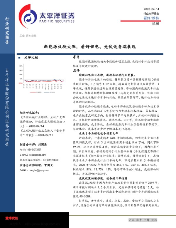 【太平洋证券】【20200414】新能源板块大涨,看好锂电、光伏设备端表现-5页