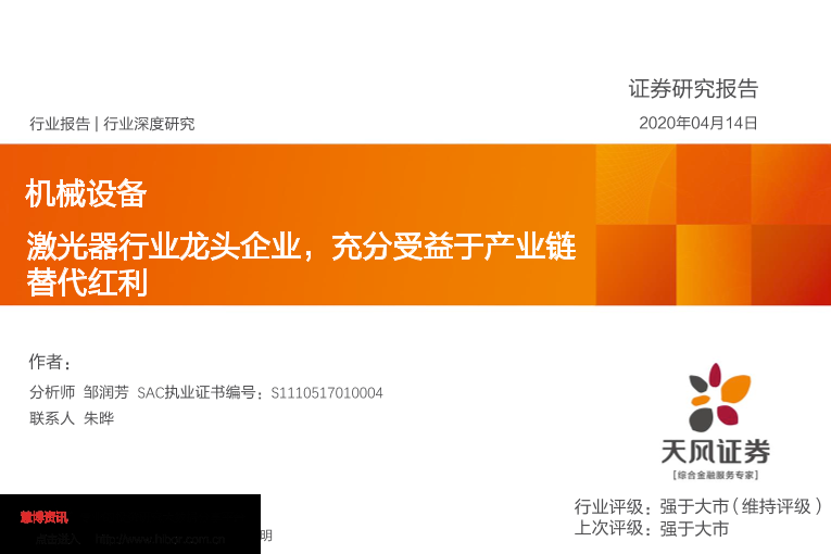 【天风证券】【20200414】机械设备行业深度研究:激光器行业龙头企业,充分受益于产业链替代红利-23页