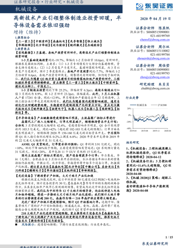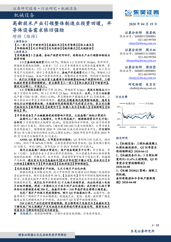 【东吴证券】【20200419】20200419-东吴证券-机械设备行业跟踪周报:高新技术产业引领整体制造业投资回暖,半导体设备需求依旧强劲-15页