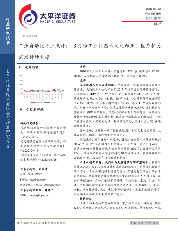 【太平洋证券】【20200420】工业自动化行业点评:3月份工业机器人同比转正,医疗相关需求持续火爆-5页