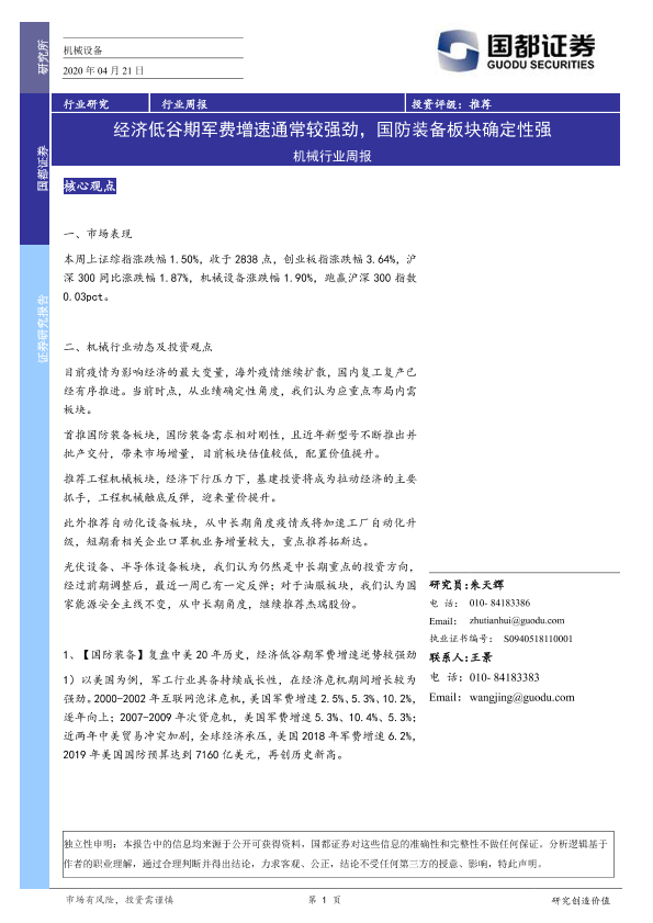 【国都证券】【20200421】20200421-国都证券-机械行业周报:经济低谷期军费增速通常较强劲,国防装备板块确定性强-4页