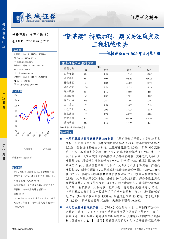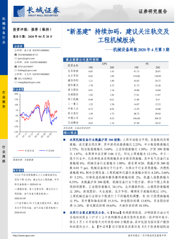 【长城证券】【20200420】20200420-长城证券-机械设备周报2020年4月第3期:“新基建”持续加码,建议关注轨交及工程机械板块-20页
