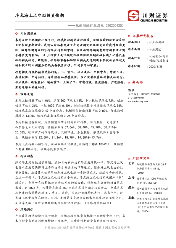 【川财证券】【20200425】先进制造行业周报:浮式海上风电掀投资热潮-10页
