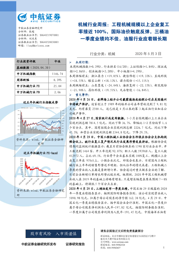 【中航证券】【20200503】20200503-中航证券-机械行业周报:工程机械规模以上企业复工率接近100%,国际油价触底反弹,三桶油一季度业绩均不佳,油服行业应着眼长期-8页