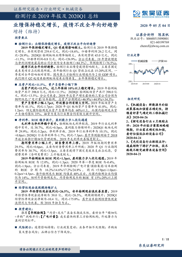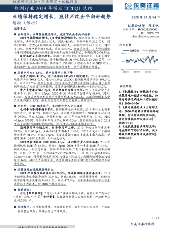 【东吴证券】【20200504】检测行业2019年报及2020Q1总结:业绩保持稳定增长,疫情不改全年向好趋势-11页