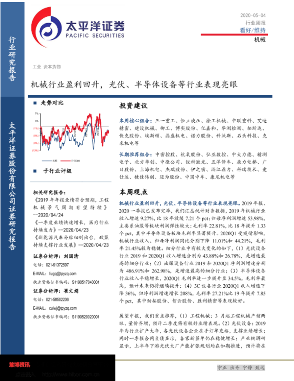 【太平洋证券】【20200504】20200504-太平洋-机械行业周报:机械行业盈利回升,光伏、半导体设备等行业表现亮眼-15页