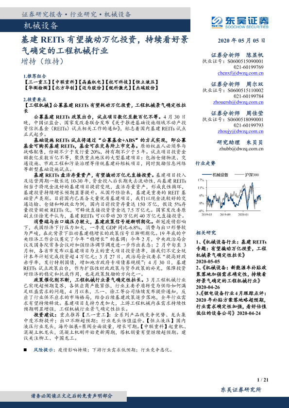 【东吴证券】【20200505】机械设备:基建REITs有望撬动万亿投资,持续看好景气确定的工程机械行业-21页