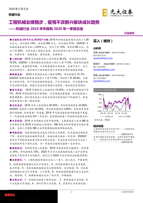 【光大证券】【20200506】机械行业2019年年报和2020年一季报总结:工程机械业绩稳步,疫情不改新兴板块成长趋势-20页