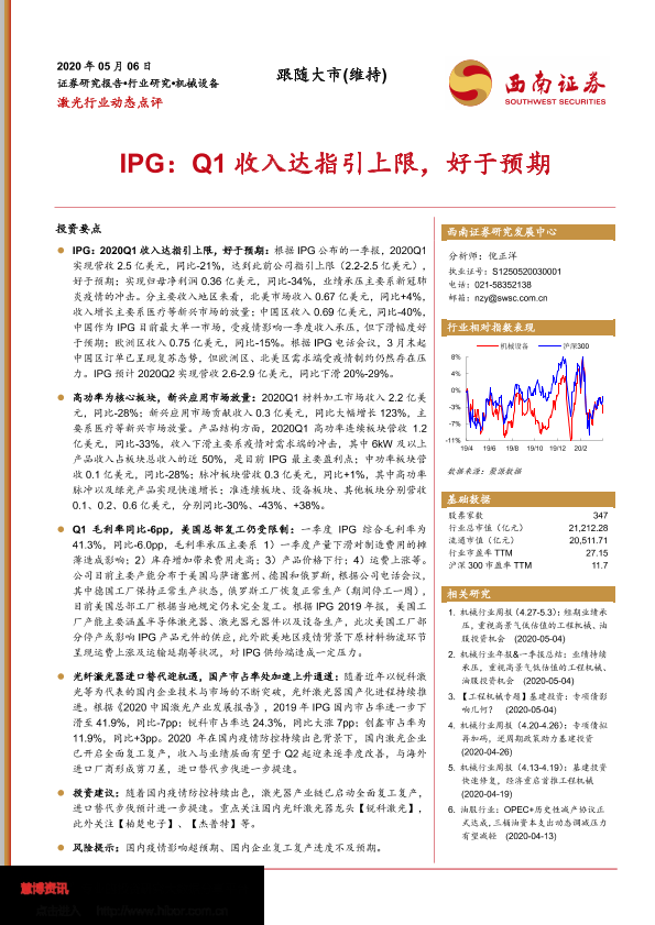 【西南证券】【20200506】激光行业动态点评:IPG:Q1收入达指引上限,好于预期-3页