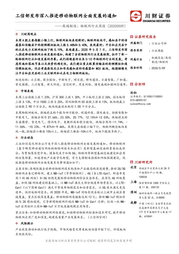 【川财证券】【20200509】高端制造:物联网行业周报:工信部发布深入推进移动物联网全面发展的通知-20页