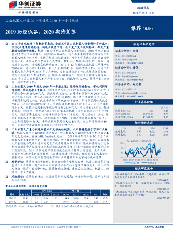 【华创证券】【20200511】工业机器人行业2019年报及2020年一季报总结:2019历经低谷,2020期待复苏-14页