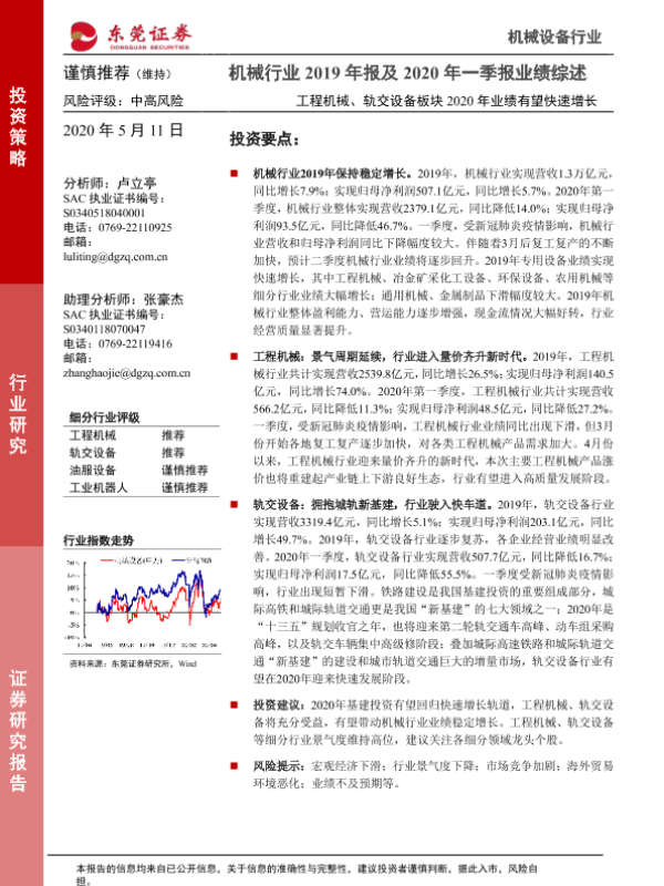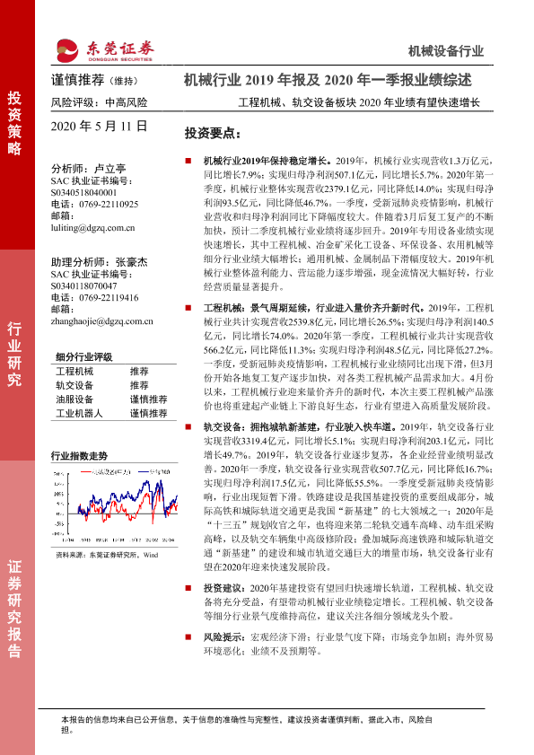 【东莞证券】【20200511】机械行业2019年报及2020年一季报业绩综述:工程机械、轨交设备板块2020年业绩有望快速增长-17页