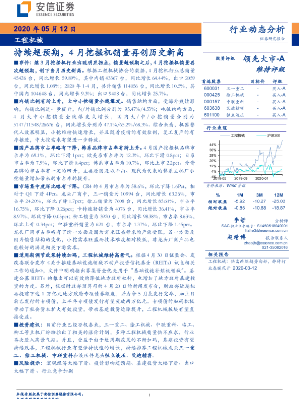 【安信证券】【20200512】工程机械:持续超预期,4月挖掘机销量再创历史新高-3页