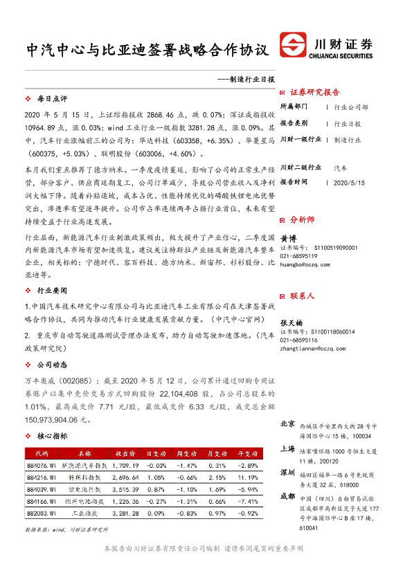 【川财证券】【20200515】制造行业日报:中汽中心与比亚迪签署战略合作协议-3页