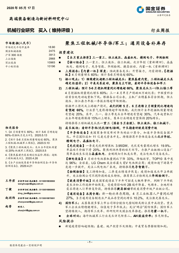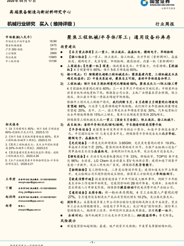 【国金证券】【20200517】20200517-国金证券-机械行业研究周报:聚焦工程机械 半导体 军工;通用设备补库存-22页