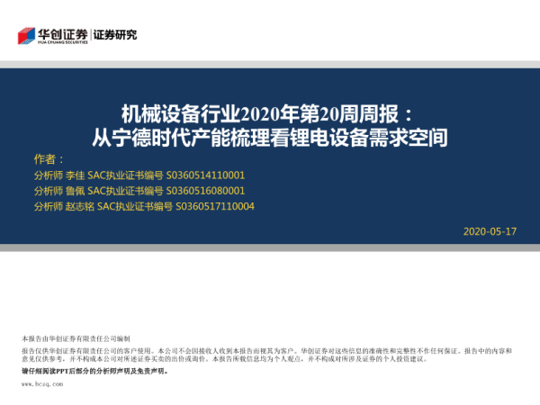 【华创证券】【20200517】机械设备行业2020年第20周周报:从宁德时代产能梳理看锂电设备需求空间-27页