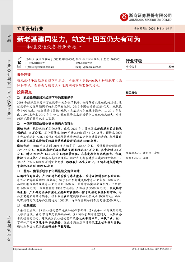 【浙商证券】【20200519】20200519-浙商证券-轨道交通设备行业专题一:新老基建同发力,轨交十四五仍大有可为-32页