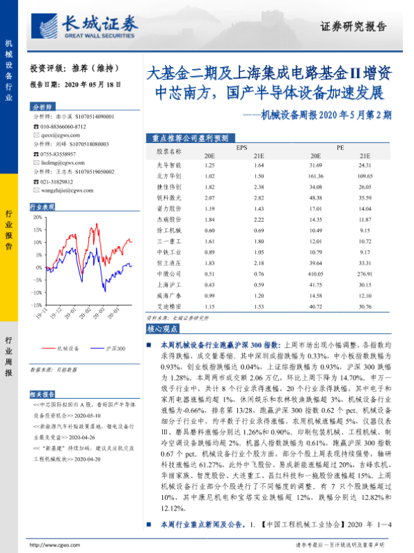 【长城证券】【20200518】机械设备周报2020年5月第2期:大基金二期及上海集成电路基金II增资中芯南方,国产半导体设备加速发展-18页