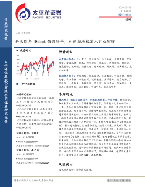 【太平洋证券】【20200523】20200523-太平洋-机械行业周报:科沃斯与iRobot强强联手,加速扫地机器人行业回暖-11页