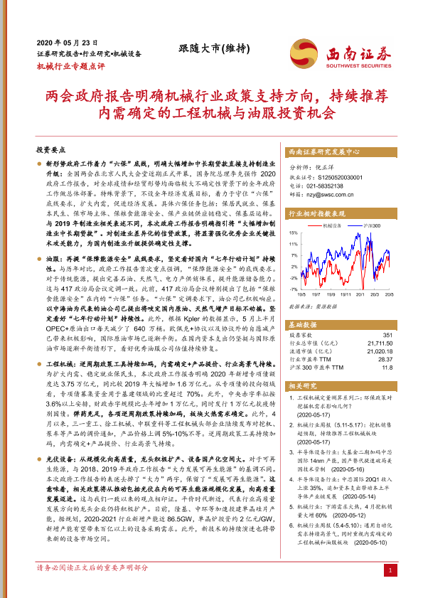 【西南证券】【20200523】两会政府报告明确机械行业政策支持方向,持续推荐内需确定的工程机械与油服投资机会-4页