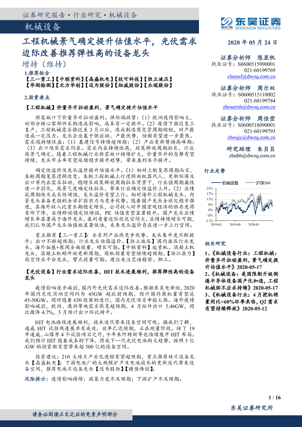 【东吴证券】【20200524】机械设备:工程机械景气确定提升估值水平,光伏需求边际改善推荐弹性高的设备龙头-16页