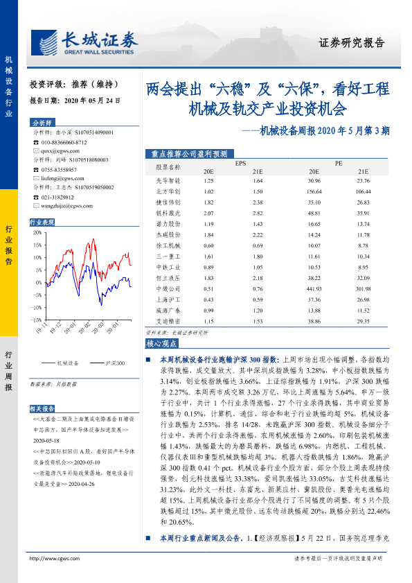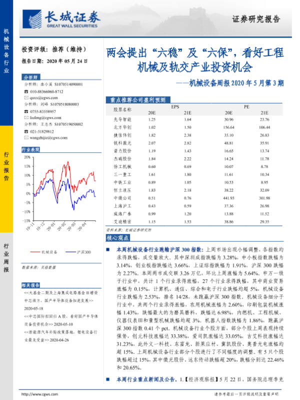 【长城证券】【20200524】机械设备周报2020年5月第3期:两会提出“六稳”及“六保”,看好工程机械及轨交产业投资机会-19页