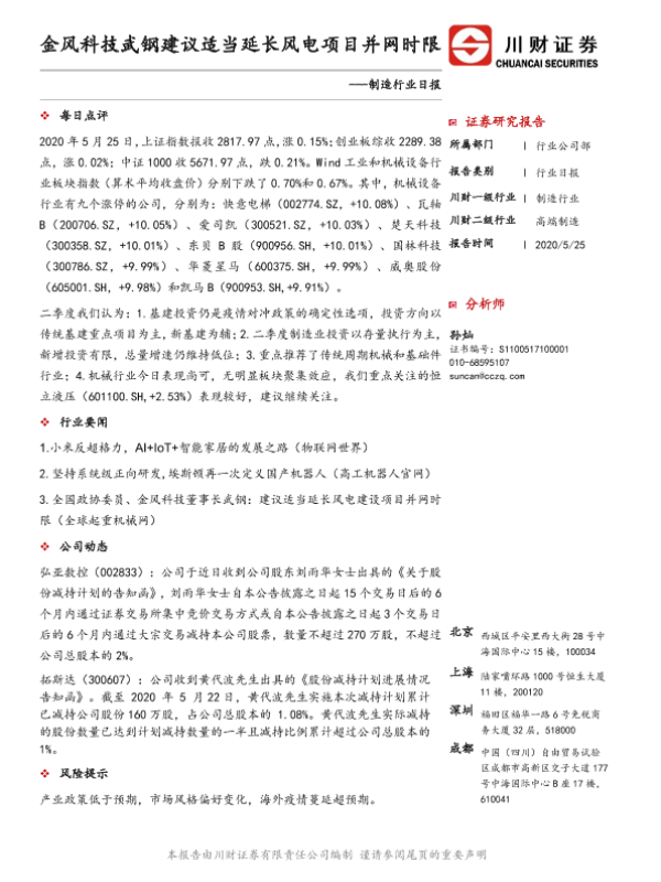 【川财证券】【20200525】制造行业日报:金风科技武钢建议适当延长风电项目并网时限-2页