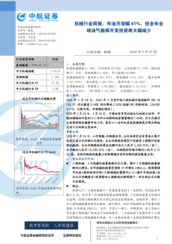 【中航证券】【20200529】20200529-中航证券-机械行业周报:布油月涨幅41%,但全年全球油气勘探开发投资将大幅减少-6页