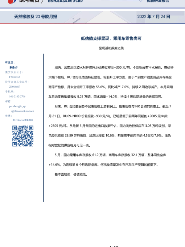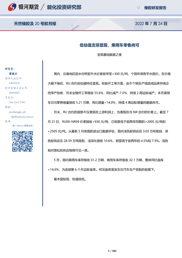 【银河期货】【20220724】天然橡胶及20号胶月报:呈现基础数据之美,低估值支撑显现,乘用车零售尚可-101页
