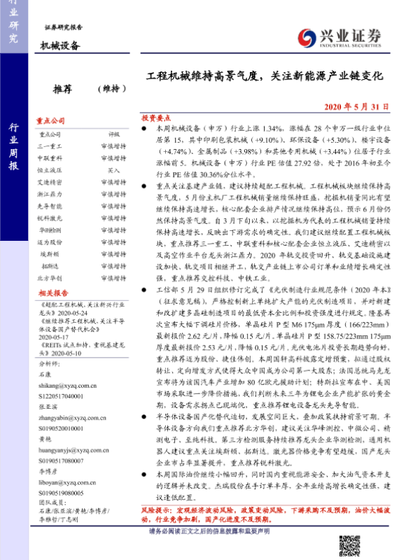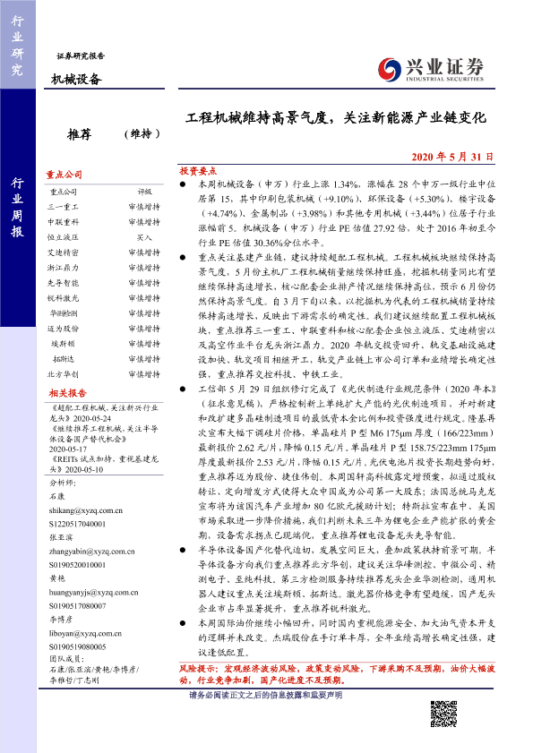 【兴业证券】【20200531】20200531-兴业证券-机械设备行业周报:工程机械维持高景气度,关注新能源产业链变化-17页