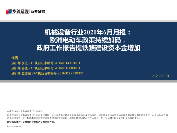 【华创证券】【20200531】机械设备行业2020年6月月报:欧洲电动车政策持续加码,政府工作报告提铁路建设资本金增加-26页