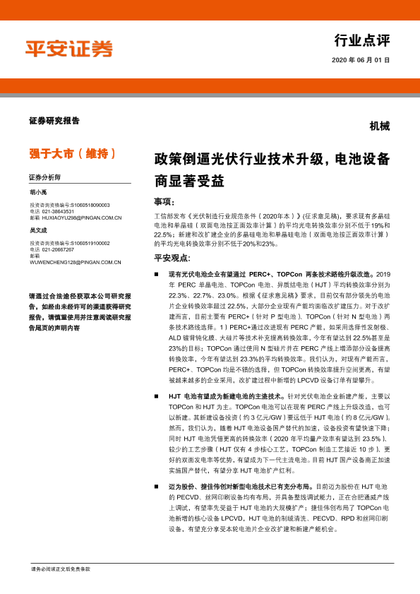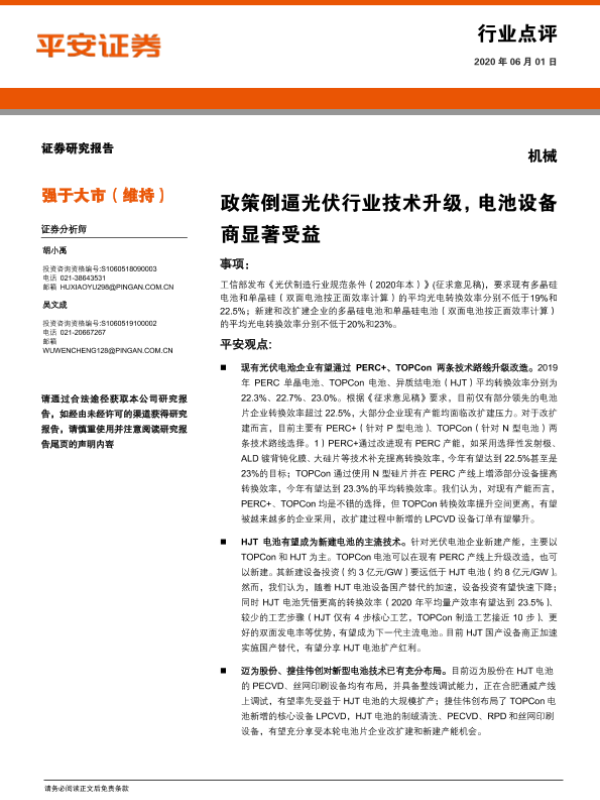 【平安证券】【20200601】机械行业点评:政策倒逼光伏行业技术升级,电池设备商显著受益-3页