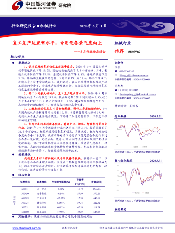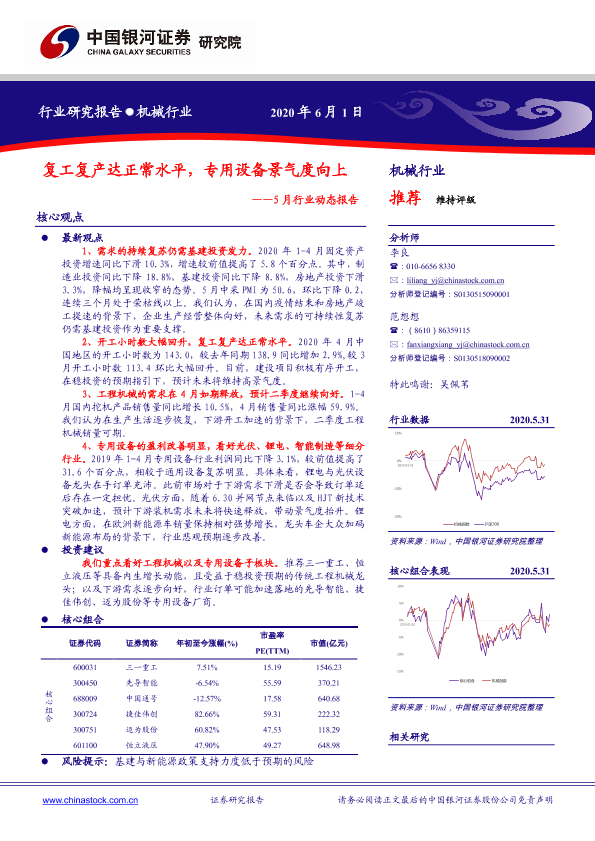 【银河证券】【20200601】20200601-中国银河-机械5月行业动态报告:复工复产达正常水平,专用设备景气度向上-28页