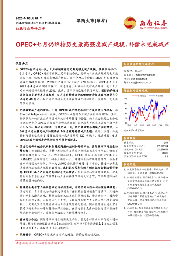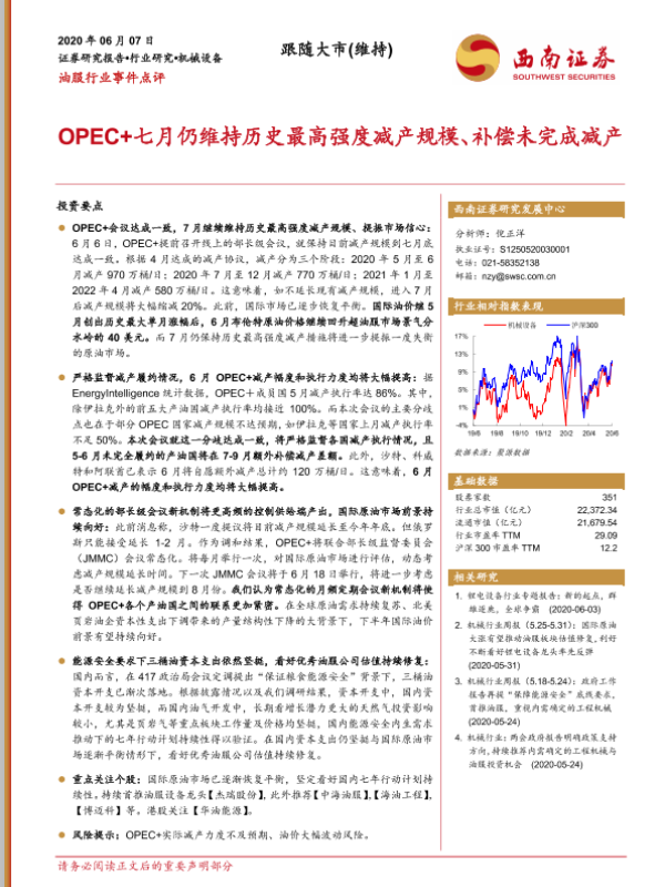 【西南证券】【20200607】油服行业事件点评:OPEC+七月仍维持历史最高强度减产规模、补偿未完成减产-3页