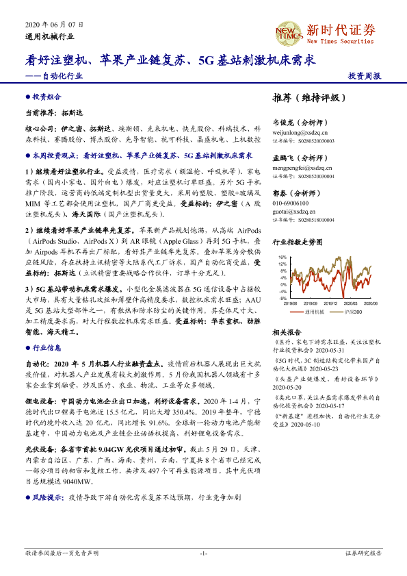 【新时代证券】【20200607】20200607-新时代证券-自动化行业投资周报:看好注塑机、苹果产业链复苏、5G基站刺激机床需求-14页