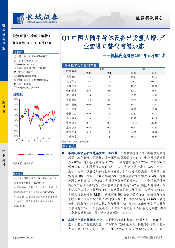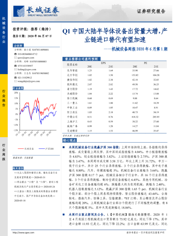【长城证券】【20200607】机械设备周报2020年6月第1期:Q1中国大陆半导体设备出货量大增,产业链进口替代有望加速-19页