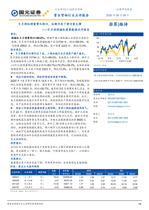 【国元证券】【20200609】5月份挖掘机销量数据点评报告:5月挖机销量势头依旧,后续仍有下游内需支撑-2页