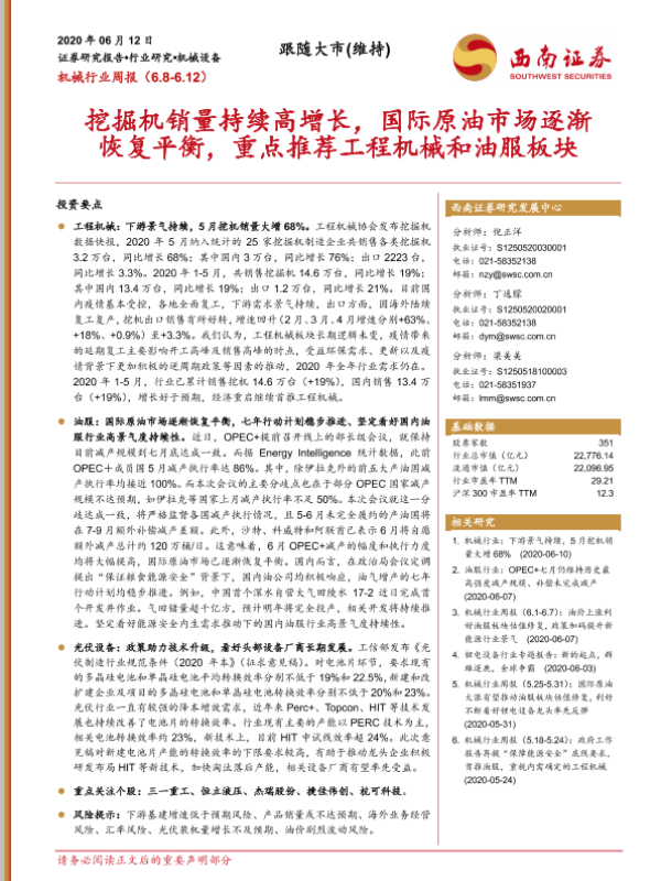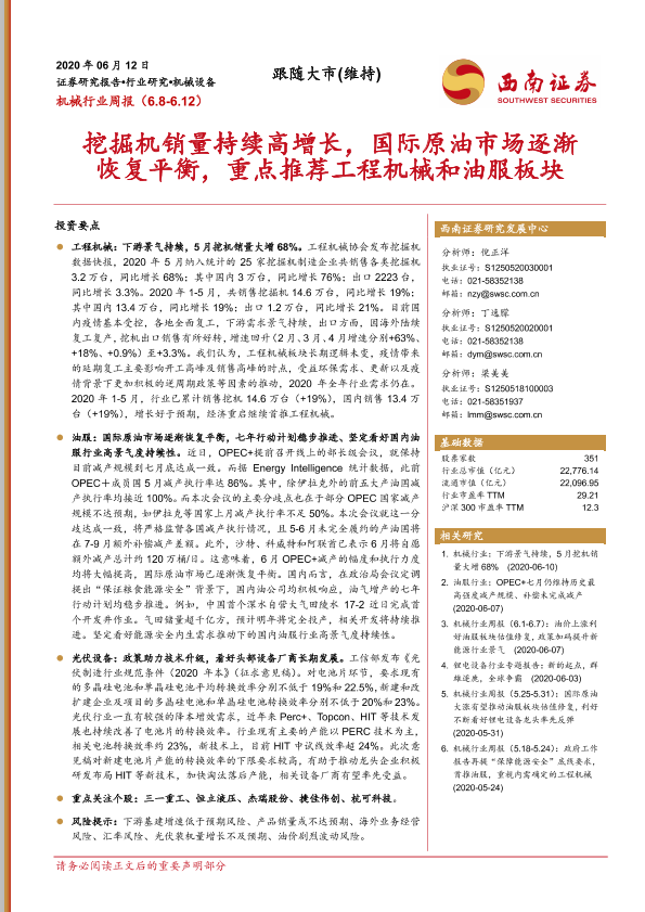 【西南证券】【20200612】20200612-西南证券-机械行业周报:挖掘机销量持续高增长,国际原油市场逐渐恢复平衡,重点推荐工程机械和油服板块-19页