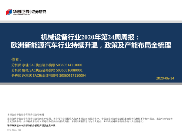 【华创证券】【20200614】机械设备行业2020年第24周周报:欧洲新能源汽车行业持续升温,政策及产能布局全梳理-27页
