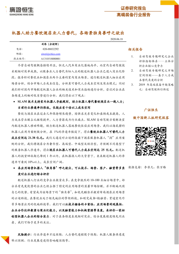 【广证恒生】【20200618】机器人助力餐饮酒店业人力替代,各场景独角兽呼之欲出-24页