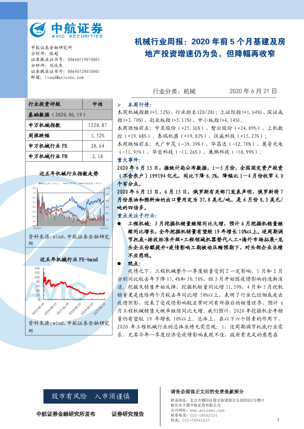 【中航证券】【20200621】2020年前5个月基建及房地产投资增速仍为负,但降幅再收窄-6页