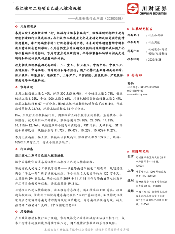 【川财证券】【20200628】先进制造行业周报:昌江核电二期项目已进入核准流程-8页
